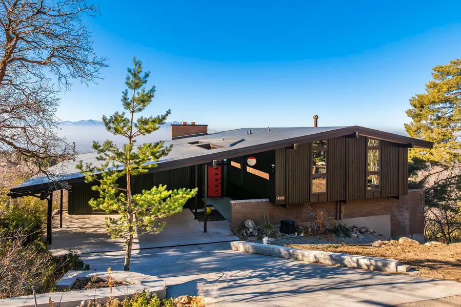 The main volume settles confidently behind a privacy wall in front, cool and composed, while the south wing lifts and reaches, cantilevering lightly over the hillside with a butterfly’s grace. A stand of scrub oak gathers around the house from the sides and rear, creating a sense of seclusion and belonging. A central walkway leads to the cheerfully orange front door, flanked on one side by a carport that is both fetching and befitting. The home’s thoughtful siting captures open valley views to the back and preserves privacy from the front. Just steps away, Neff’s Canyon Trail offers a direct con...
