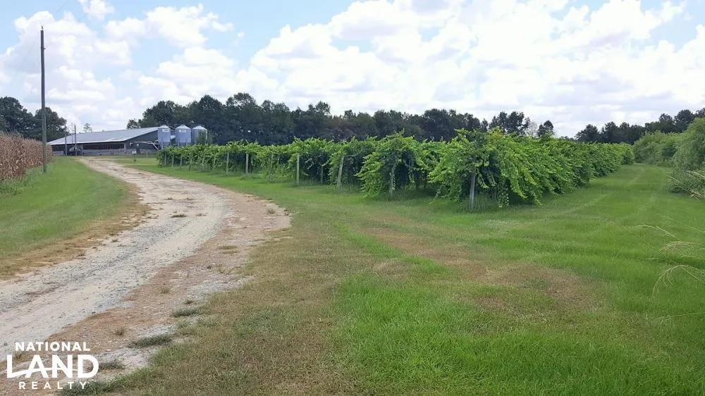 North Carolina income-producing vineyard and hog farm. 45 +/- acres of diversified farmland. 2 income producing hog nurseries, 7-acre vineyard (w/ winery contract), and 27 acres of row crop! Included are 7 buildings, irrigation wheels/pumping equipment for nurseries. Hog houses have hot/cold showers. Property generates approximately $170,000 of diversified income each year! Equipment available for sale: tractors, vineyard equipment, implements, and others. Seller will consider working the farm after its sale. There are 2 additional acres w/: office building, mobile home, and 2012 1,900 sqft 3/2 available. For more information, contact Cailein directly at email: ccampbell or phone: 910-338-9667!