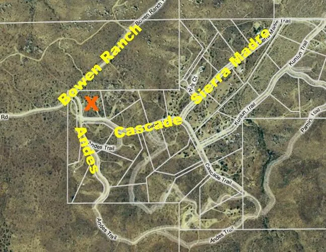 Up in the scenic Bowen Ranch/Juniper Flats area. Well maintained fire roads all the way to Big Bear from here! Lovely remote area! Boundaries in aerial map are only approximate.