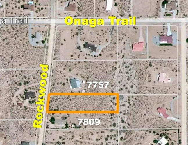 Driving Directions: From I-10, take Hwy 62 through Yucca Valley. Before reaching downtown Joshua Tree, turn right on La Contenta Rd. Turn left on Yucca Trl. Yucca Trl becomes Alta Loma Rd. Turn right on Olympic Rd. Turn left on Onaga Trl. Turn right on Rockwood Rd. The parcel is on the left between the houses at 7757 and 7809 Rockwood. Take an aerial map.