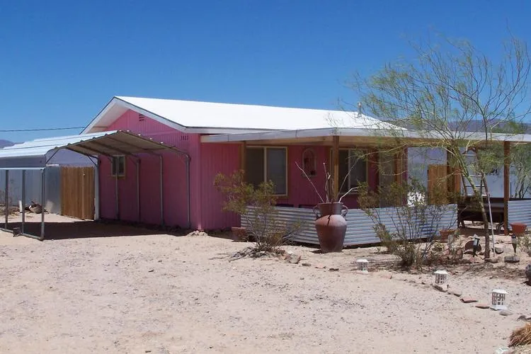This is a very cute little pink cabin. She has made a large corrugated aluminum back fenced yard,a very cute front covered sitting area. It is one good size room, kitchen and bath. Double pane windows, blinds and two ceiling fans. There is a carport, two storage units and a water holding tank. There is power to the cabin, five acres with great views in every direction. Don't Wait - Call Now!!