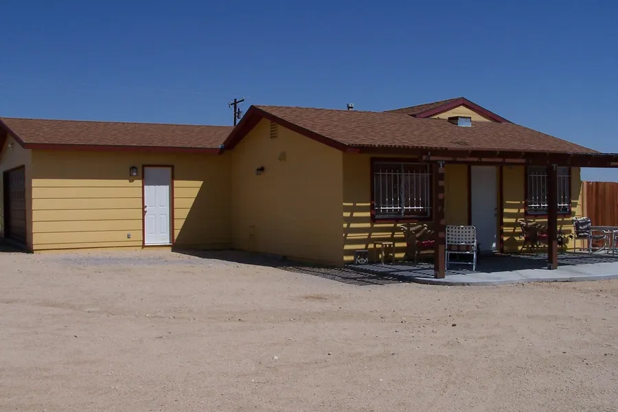 Two homes on one 5 acre parcel of fantastic view property. There is a main house with 2 bedrooms, 1 bath, fantastic new kitchen and living room with an attached over-sized two car garage. The guest house sits high up on the hill and is a studio, with kitchen and bath. Both of these homes are cute, cute, cute. There is also a nice storage building and the property is fully fenced with a high grade chain link fence, with rolling drive through gate. This property is beautiful, it just calls for indoor outdoor living, the views are of the National Park and Bartlett Mountain. It is private, yet only yards away from a paved road. Both homes have been remodeled and look great.You can be in downtown Joshua Tree or Yucca Valley in about 7 minutes. This is a fan...