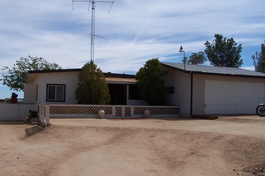 This is a lovely home sitting on 2.5 acres of land, aprx. 1 acre fenced, with fantastic Views in every direction. You can see the top of the National Monument, out to 29 Palms, Landers, Pipes Canyon and the City lights of Flamingo Heights. This home is furnished and is ready for move in. It is indoor outdoor living, with multiple patios, Trees, plants a lovely fountain in the back patio, pond in the side patio and covered seating in the front patio. Sliding glass doors off the living room and office/dinning gives a light bright indoor/outdoor setting. There is a electric fireplace in the living room that throws ample heat. There is a Swamp cooler for the summer months. On the side next to the garage is a dog run. This home is decorated so very cute, inside and out. There is a large two car detached garage with inside laundry. Most of the furn...