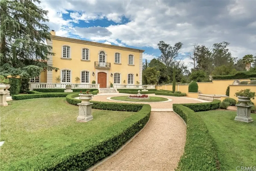 A TRIP INTO THE FRENCH COUNTRYSIDE! Hidden in over 2 acres of lush grounds and detailed with exquisite French artifacts, this estate is unique. Magnificent Provencal style manor house was completed in 2006 with over 5500 sq ft of luxurious living. Enjoy the formal gardens as you enter from the circular driveway. Nothing compares to the incredible quality and attention to detail from the stone accents to the solid French walnut doors. Custom crown moldings at the 12' ceilings are different in each room. Separate dining room has a barrel sky blue ceiling and doors to the front terrace. Living and family rooms have custom french stone mantels. Incredible library has custom cabinets. As does the farmhouse kitchen. Honed stone counters, large island with sink as well as additional 2 farm sinks. Chef worthy La Cornue stove is flanked by 2 antique stone column corbels. 2 drawer dishwashers as well as a standard one. Downstairs bedroom has private bath. Upstairs are 2 family bedrooms with en suite baths and walk-in closets. Enormous main suite has an incredible dressing area and separate retreat. Huge bath with solid rose marble bathtub and counters. Viewful terrace on 3 sides of the home. Step down to the gorgeous pool and spa. Greek temple-style pool house has a 3/4 bath and could be a guesthouse. Shady patios for entertaining, citrus grove and over-sized 3 car garage. A special property.
