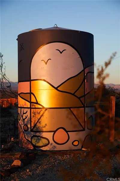 Secluded Desert Retreat ON 5 Acres. Panoramic views from Indian Cove to Pipes Canyon. A true labor of love, the home includes a water tank mural by south west artist Tom Jean Web. Operating as a highly successful short term rental. All appliances included. Fully furnished inside and out. Includes linens and dishes. Step out of the bedroom and into the backyard that includes an outdoor shower, bathtub, and unique van that has been converted into a lounging area. Large fireplace in living area, midcentury moveable fireplace on deck, and two firepits. Walk through bedroom and a master bedroom with a view of the desert. Owner has custom made closet rods. Enjoy your morning coffee on the covered patio while watching the sun rise. Detached garage with washer and dryer and an attached two car carport.