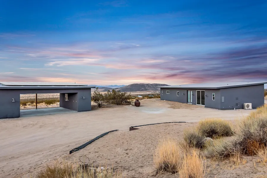 A unique opportunity to own a modern, new construction, fully sustainable off-grid home by Baltic Sands Inc sitting on almost 5 acres bordering the Joshua Tree National Park with stunning panoramic views. This luxurious home doubles as a retreat with three large master suites each with its own beautiful view and entrance. Featuring an open floor plan, screed flooring, a yoga/ meditation room nd a large patio with a fire pit and a seven person spa. The kitchen has mahogany shelving, stainless steel appliances, and caesarstone countertops. Completely solar powered and with a private water well, the house is completely self-sustainable and independent of any city utilities. Downtown Joshua Tree is a 5 minute drive, with the famous Pappy &Harriet's 25 minutes away. Perfect for a vacation getaway or short term rentals with complete privacy.