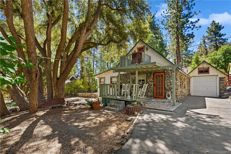 A rare find! 1920 built historic cabin known as Seven Oaks Cottage. Located on an expansive, beautifully scenic lot highlighted by the impressive 7 oak tree cluster gracing the front yard, this home exudes exceptional character. Natural rock trim abounds while a cozy country front porch welcomes you inside to an open beam living room with massive brick fireplace. Natural pine wood flooring, paneling, windows, and cabinetry are found throughout the home giving it that true "cabin" feeling. Downstairs offers a good size kitchen with beautiful pine cabinetry and a rock lined wine cellar, cozy breakfast nook/dining area, full bath, plus a 2nd 3/4 bath adjacent to the master bedroom. Master has 2 closets and beautiful yard views. A wood stairway leads up to a large attic style bedroom with French door to viewing deck, plus a 2nd room that could be a small 3rd bedroom, office or craft room. All charmingly furnished, with most furnishings included in sale. The exterior offers multiple scenic sitting areas, a storage building, plus plenty of extra land for possible expansion/additional structures. Fully fenced lot including rolling electric gate for driveway. Driveway is extra long with plenty of room for parking, and leads to the single car garage that is extra deep at 29 feet long and houses the laundry area. Truly a one of a kind, remarkable piece of history perfect for full time living, vacation home, or vacation rental in the cooler climate of the mountains where you can enjoy winter skiing, summer hiking, and so much more in the quaint village of Wrightwood while still only minutes to the 15 freeway!