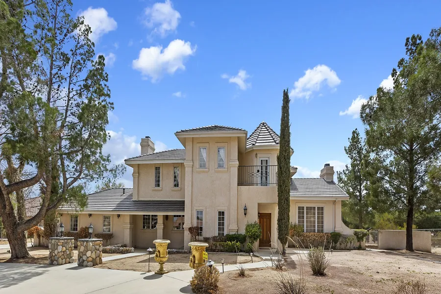 Custom built Mediterranian Estate located in the desirable APPLE VALLEY RANCHOS. Enter through electric wrought iron gates, continue along the circular driveway to your beautiful home that awaits. The home sits on one acre with beautiful mountain and golf course views. Your park like setting is well appointed with a regal fountain, mature trees, and easy care desert landscaping. Bring your RVs also. When you enter, you will first fall in love with the high beamed ceilings, marble floors and custom woodwork. The home has a gorgeous formal living room with a cozy fireplace for the chilly nights, and a very large family room with fireplace number two. You will also be delighted with an office, formal dining room with tray ceiling, beautiful kitchen with stainless steel appliances, powder bathroom and separate laundry room. Upstairs is your beautiful master suite, and luxury bath, and 2 more...