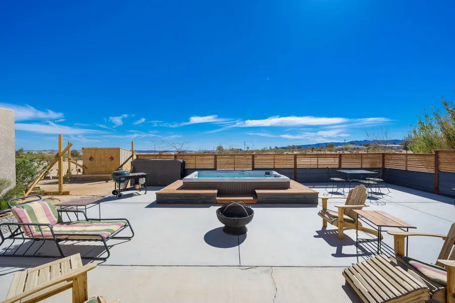 Just a few miles away from the Joshua Tree National Park & located in North Joshua Tree, this property offers a 5-acre lot with a beautiful Santa Fe Adobe House. The house itself offers; 2 bedrooms, 2 bath, Kitchen, dining and Living combo, a detached 2 car garage & an outdoor patio (The patio comes with an above ground heated swim spa.) Please note that the property is also currently set up as a successful Horse property, with winter and summer barns for the comfort of the horses but it can easily be converted into anything one desires.