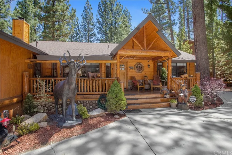 Welcome home to your log cabin in desirable Fox Farm neighborhood in Big Bear Lake. This home has it all for mountainous living. Two two car garages, gated RV/boat parking, large L shaped driveway for toys and decks in the front and backyard to enjoy the fresh air, blue skies and beauty of the lush neighborhood.Appreciate the log accents inside. This 3 bedroom 2 bathroom is a little over 1,500 sq ft. Walk through the threshold to the open floor plan. High ceilings with log beams and natural light fills home. Kitchen has a large peninsula with tons of granite countertop space with raw edges. Abundance of cabinet storage with some glass doors giving this kitchen tons of character. Bar seating around the peninsula and open to the dining room which makes it perfect for entertaining. Dining room walls is lined with windows with a captivating antler chandelier. Cuddle up to the large floor-to-ceiling stone fireplace with wood mantle. There are two doors to the backyard with stunning bear screen door. The side deck is covered with built in bar seating. This deck wraps around to the back of the house with more space to lounge. Stairs and ramp lead you down to the landscaped backyard. Newer spa area was built with concrete slab and patio cover with stones through the grass. Second garage is at the in he back corner of the lot, side door and large ramp to get your toys inside. This backyard is set up to entertain outdoors to enjoy Big Bear weather. Great location close to local restaurants, shopping, Big Bear Village, Big Bear Lake and everything Big Bear has to offer! Love where you live. Love living in Big Bear.
