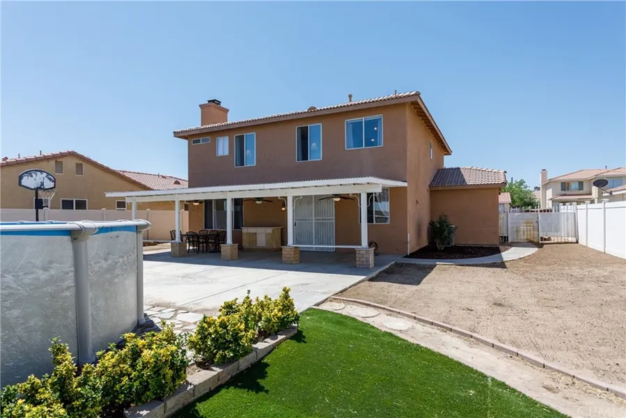 Don't miss out on this designer home offering a spacious yard with pool in the wonderful city of Adelanto. This highly sought after floor plan features 5 bedrooms, 2.5 bathrooms, an inside laundry and 3-car garage. The wall of windows offers a bright and open orientation with 2,013 square feet of comfortable living space for everyone. This open concept home offers a dining room that opens to the family room and kitchen with backyard views and access through the sliding glass door. The kitchen offers designer white cabinets for ample storage, a large pantry, laminate counters, tile flooring and a breakfast bar perfect for mornings with the family. Enjoy game night in front of the cozy fireplace in the family room. The master suite offers high ceilings, trendy new laminate flooring, a large walk-in closet and a bathroom with a spacious vanity and full bath. The secondary bedrooms share an upstairs hall bathroom. Custom appointments include newer interior paint, upgraded laminate flooring, invisible pet fence, water softener, drinking water purification system and an inside laundry room with cabinets. The 3-car garage has the perfect space for a workbench or workout area. While the large backyard offers an above-ground pool, artificial grass, planters and covered patio perfect for dining al-fresco. This sought-after community is in close proximity to schools and perfectly located to enjoy the exceptional restaurants and shopping that Adelanto has to offer.