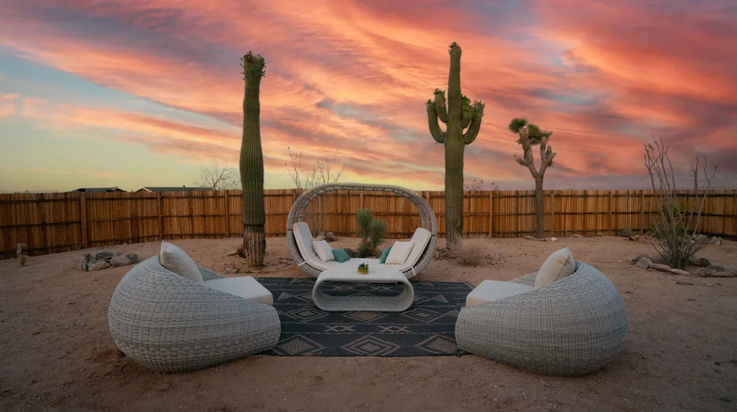 Premier Joshua Tree Property In One Of The Most Sought After Locations In The Hi-Desert! Minutes from hip shopping, boutique dining, and a quick drive to Joshua Tree National Park, you'll find this elegantly remodeled Mid-Century Home. Nestled in a cove with views of the Bartlett Mountains, mature Joshua Trees, native cacti, and other desert flora, this 3 bedroom, 1 bath stunner offers an abundance of space for both indoor and outdoor entertaining, ideal for soaking up the sunshine and enjoying the very best of high desert living. Entering this 1958 gem, gorgeous beamed ceilings welcome you into its bright, open floor plan, where you'll be wrapped in soothing vibes that will make you want to stay and stay. Luxurious details abound in this tasteful hideaway, including a newly renovated kitchen and bath, custom white oak cabinetry, chic polished concrete floors, top-of-the-line water filtr...