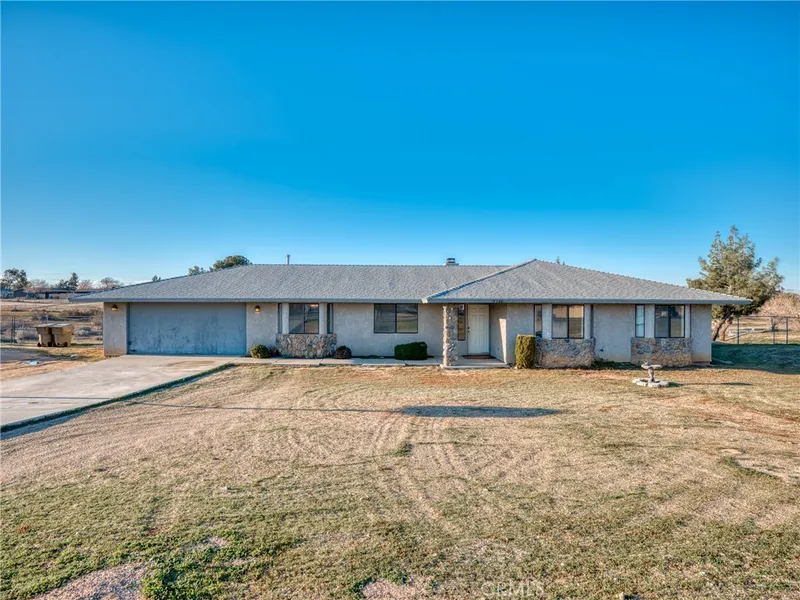 This lovely home is owned by the original owners and has been very well cared for throughout the years. Located in the highly desirable area of Southeast Hesperia on a fully fenced lot - almost 1.25 acres. EXCELLENT commuter location. Upon entry, you are greeted with a spacious formal living room and formal dining area w/ big windows. The open kitchen has lots of cupboard space and many windows overlooking the large, clean backyard. Open concept floorplan where both the kitchen and the casual dining area overlook the den! The den features high ceilings, plant shelves as well as a cozy rock fireplace. Two very good-sized guest bedrooms - both with ceiling fans and bay windows. Very spacious primary bedroom has its own private bath with a double sink vanity and convenient walk-in shower.....the exterior door in the master will lead you to a nice private patio! Expansive, fully fenced backy...