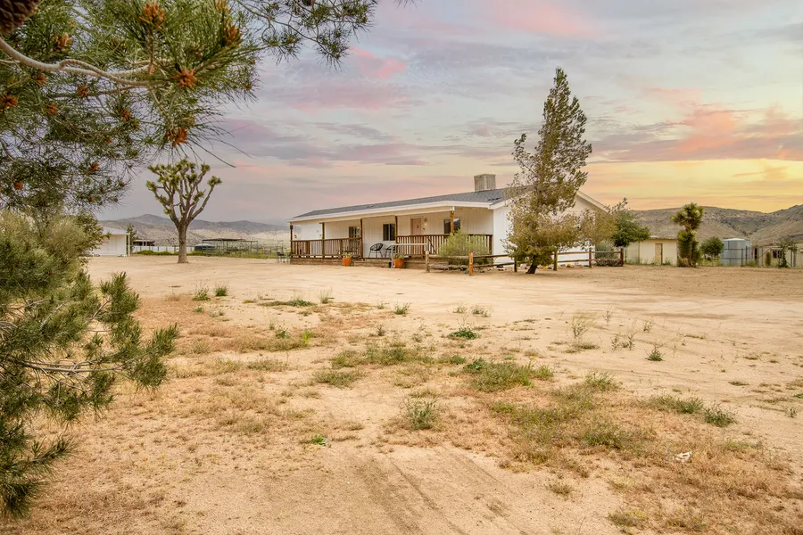 The best deal in town! Profiled in Dwell Magazine and The New York Times, this stylish desert escape is located in the heart of Pioneertown proper. Walk to Pappy & Harriet's and Red Dog Saloon in mere minutes while Joshua Tree National Park is just a short drive away. Meticulously designed, renovated, and cared for, this sublime home is also a 5 Star Superhost property on Airbnb totally turnkey and ready for its next adventure. Immense pride of ownership and major income potential await. After a visionary renovation, the home is currently a haven for artists and musicians, a favorite family getaway, and an extraordinarily profitable short term rental. The completely enclosed 1.26 acres is a peaceful and private sanctuary unlike any other in the entire region with huge old growth Joshua Trees sprinkling the property. The main house spans approximately 1,600 square feet: a sumptuous primary suite with oversized walk-in closets and French doors that open to a private al fresco dining patio, two additional bedrooms, two full baths, a massive open plan living, dining, and kitchen area with brilliant natural light, and upgrades throughout include eco-friendly wide plank floors, designer lighting fixtures and hardware, new central A/C and heat, plus a dedicated laundry room and a great sitting/yoga room that could easily become the home's fourth bedroom. An incredible covered front porch with seating and swings offers the perfect vantage point to enjoy sweeping boulder views of the surrounding mountains and the most serene sunrises and sunsets around. A gorgeous flagstone walkway leads to the relaxing cowboy pool perfect for hot desert days and romantic stargazing in the evenings. Two gigantic airplane hangar-esque storage buildings are primed as a lovely guest casita and a game room. Multiple other structures, entertaining spaces, buildable land, and horse corrals grace this amazing property. Power up your Tesla or connect your Airstream at the 220V charging station. Available fully furnished with artisan furniture by ZATION Woodworks, local art by Jessie Keylon whose studio is on Mane Street down the way, wall hangings from Block Shop Textiles, Real Fun Wow, and Midday Clay.
