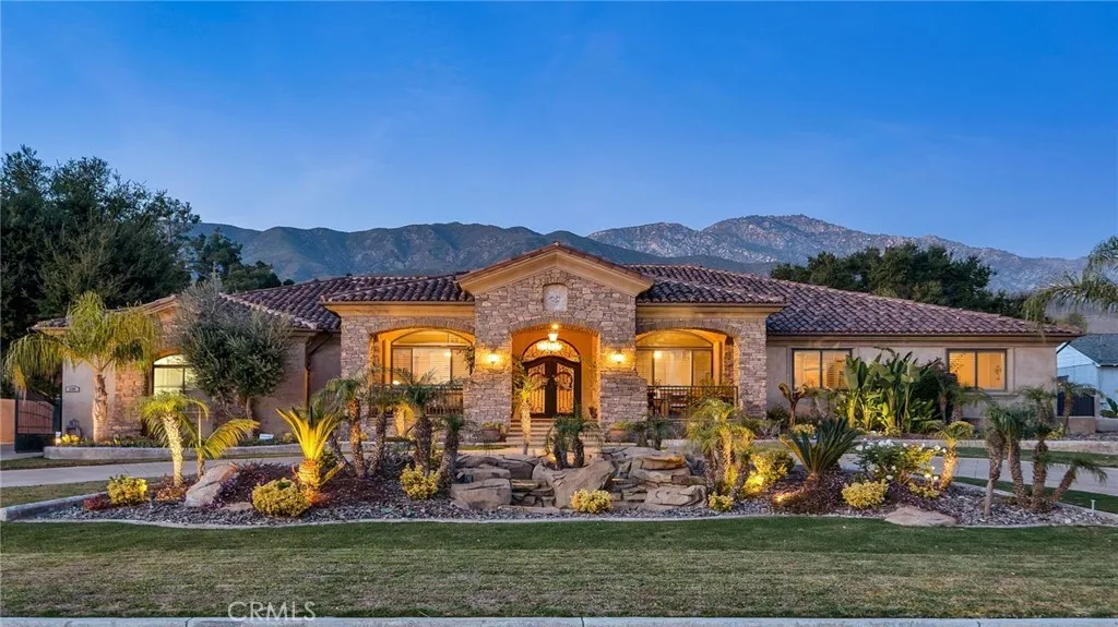 designed especially with Southern California's mild climates. This newer construction masterpiece was completed in 2016. The main house featuring 4 bedrooms with a 5th bedroom option and 3.5 baths. Attached Casita studio w/3/4 bath, 1 bedroom ADU with 3/4 bath. With an attached 4 car garage and detached 2700 SF detached garage with 20' ceilings, 47'X56' apprx. w 1/2 bath and workshop. Upon entering the smooth stucco finished Estate and perimeter walls to match along with the San Gabriel Mountains as your backdrop. Once inside you find warm colors, high ceilings with a spacious family room and kitchen with open concept style living and fireplace. The kitchen with double islands one with 2 levels for the little ones to dine and prepare your favorite meals for family, friends and events all with high end appliances including double oven, side by side stainless refrigerator and freezer, 2 slide out refrigerated doors, slide out push button microwave, slide out dishwasher, 6 burner cooktop with pot filler and griddle top, coffee bar with faucet, warming oven all built into the custom kitchen cabinetry! The family room and kitchen lead out to the 1800SF - covered patio through La Quetina Bi folding Doors and custom bi folding window to open up the seamless indoor/outdoor living space! Enjoy the cool fans while watching tv above the custom Tuscan mixed stone fireplace or watching the kids swim in your custom rock fresh water pool with baja reef w/umbrella, huge waterfall, cave, jacuzzi, kiddie dip and fire feature. The outdoor patio also comes with a full sized outdoor kitchen/bar with seating area! During the winter you can still enjoy the patio with the built in ceiling heaters and "heated" concrete patio slab. The backyard with newly installed artificial turf is surrounded by custom lighting throughout and Palm trees, triple palms, bird of paradise, mango, fig, nectarine, apricot, plum, pear, apple, pomegranate, lemon, plumeria and avocado trees. The second garage with 14ft doors is ideal for the car enthusiast, up to 45' motorhome, storage for self employed anything you can think of! Included in the amenities are: Water Filtration System with Charcoal, Security System w/9 cameras and DVR, Creepy Crawler for the pool. DO NOT USE SHOWING TIME. APPOINTMENT ONLY. This home is situated an a fairly level 1.2 acre - lot that allows tons of parking for a large family, parties or hosting venues!