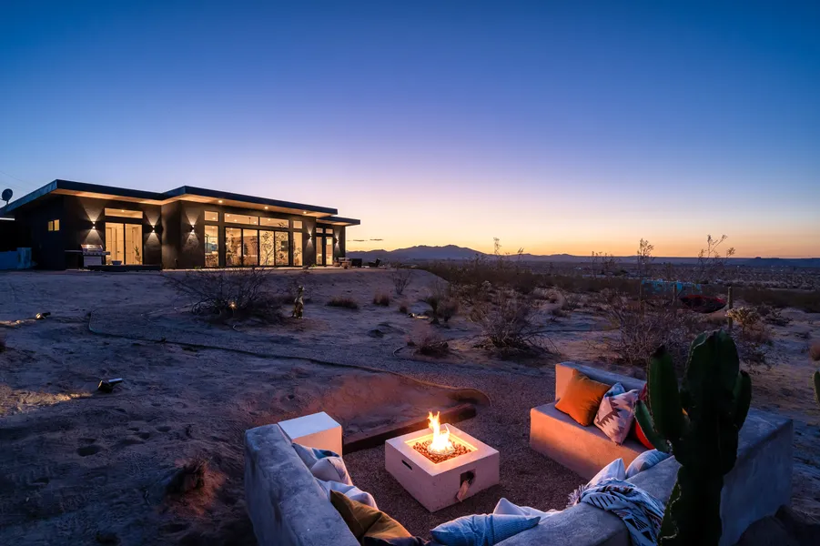 PRICE IMPROVEMENT! Welcome to 6775 Arizona Ave...an Oasis of Modern Luxury and Natural Beauty, offering a Tranquil Escape within reach of the Joshua Tree National Park. This Newly Constructed South Joshua Tree home is coveted neighborhood of Panorama Heights. Boasting stylish three bedrooms, 2 baths, a Great Room, custom kitchen, and expansive outdoor landscape with views. The Great Room features soaring 12-foot ceilings and open floor plan, it merges indoor and outdoor spaces, creating an authentic area for versatile living for relaxation or entertainment. The upgraded kitchen is a focal point, featuring Quartz waterfall edges, top-notch appliances, and a modern aesthetic for easy get-togethers. Step outside to an outdoor paradise, where expansive desert Boulder landscape views await. An outdoor shower and a hot tub provide the perfect setting for stargazing under the vast desert sky. The primary suite is a haven of luxury, offering breathtaking views, stylish decor, and a resort-like ambiance with a glass-walled shower and a soaking tub. The additional two bedrooms are thoughtfully situated on a separate wing of the home which are equally elegant. This Desert modern home invites you to experience the beauty of the desert in a contemporary and refined setting.