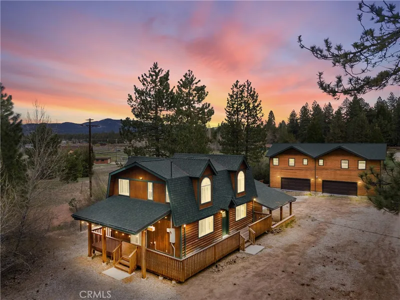 Welcome to this exceptional vacation compound in Big Bear Lake, California, offering a truly unique experience. Nestled on a 2.35-acre lot, this property features a beautiful two-story, 3-bedroom, 2.5-bath cabin home (1,542 sqft) completed in 2018, as well as a newly constructed separate 2-bedroom, 2-bath ADU home (1,250 sqft) built in 2023. Both residences boast heated plumbing lines, a valuable asset during the winter months. The main cabin exudes modern elegance and mountain charm, with spacious open-concept living areas, high ceilings, large windows with custom wood shutters, and an abundance of natural light that accentuates the stunning views. High-end finishes throughout the interior create a welcoming and refined atmosphere. The chef's kitchen features updated stainless steel appliances and custom cabinetry, perfect for culinary enthusiasts. Outdoor living spaces are ideal for entertaining or simply enjoying the tranquil surroundings. This property offers a luxurious retreat with its upscale features, contemporary design, and close proximity to the natural beauty of Big Bear Lake. The ADU property is a car lover's paradise, boasting a state-of-the-art four-car garage with ample space for vehicles, storage, mountain toys, and workshop areas. The main home also includes a 2-car garage. The garages feature high ceilings, custom storage solutions, and efficient lighting, catering to car enthusiasts and hobbyists. Above the ADU garage, a separate living space awaits, showcasing two luxurious master suites with en-suite bathrooms, providing privacy and comfort for a peaceful retreat within the property.