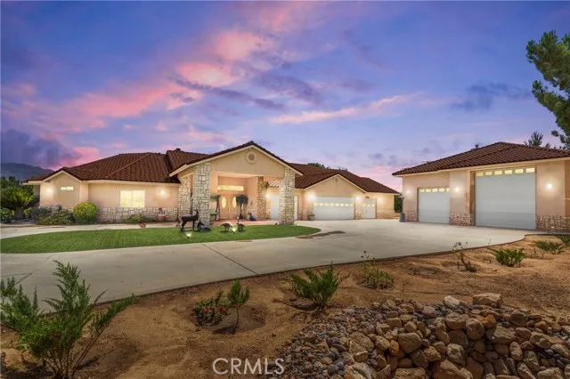 UNBELIEVABLE PROPERTY...THIS IS A CUSTOM HOME WITH VIEWS OF HESPERIA LAKES AND THE SURROUNDING MOUNTAINS. This property boasts a 4-car garage plus a massive 37x45 RV GARAGE with bathroom. Enjoy outdoor living with an inviting POOL relaxing SPA, outdoor shower, horseshoe pit, and putting green. Complete with a charming gazebo with fridge, sink and cabinets that will seat plenty of your family and friends. This home offers the ultimate blend of elegance and recreation. This Luxurious 3307 sq ft custom home features 3 beds, 3 baths, and a spacious open kitchen with granite countertops. Open Floor Plan, it's an Entertainers Delight! Gorgeous entrance that leads you to the open and airy living room with a fireplace and a wet bar. All of the bedrooms are large. The primary bath includes a separate jetted tub and a steam shower. Lots of storage. Yard is landscaped. Solar is owned. Front gate is...