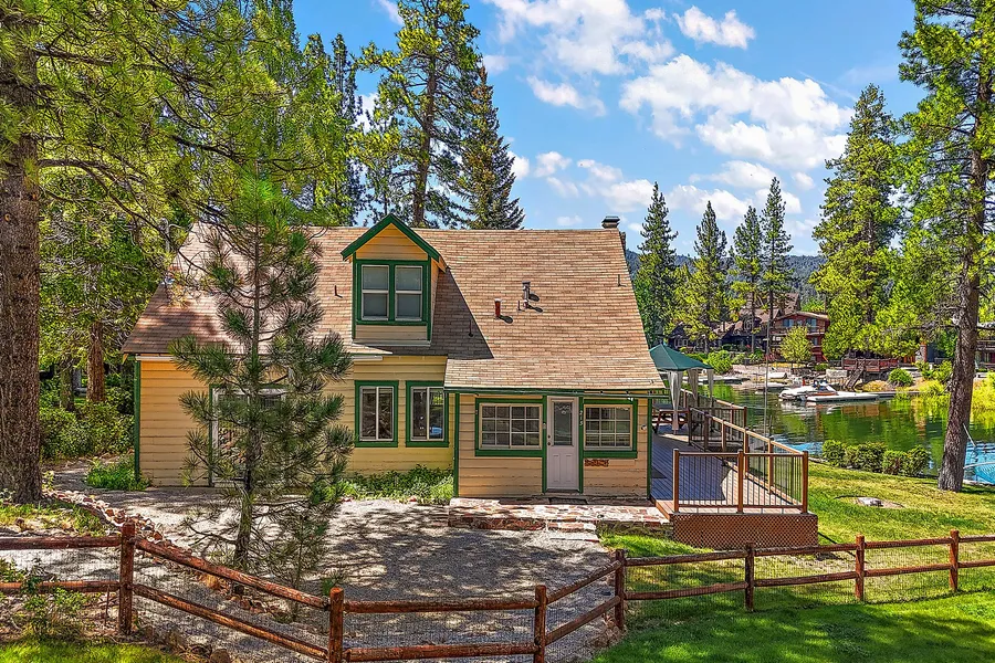 This classic summer Big Bear lakefront getaway sits towards the mouth of Sawmill cove providing a wind protected, quiet, lakeside setting from which to enjoy the sprawling lawns, soaring pines, and serene lake views this vintage cabin has to offer. Only steps away from your boat dock, you'll have easy access to all the adventures Big Bear Lake has to offer. For those looking to relax, lounge around on the spacious, outdoor, wrap-around deck complete with surround sound speakers, or swing in the breeze between the Jeffery Pines in the side yard hammock, or maybe just stare at the blue-bird skies from the sunken lakeside hot tub while listening to your favorite tunes. It's hard to imagine a better setting for summer parties, outdoor entertaining, or for kids enjoying their summers playing outside! The living room offers even more lake views with the native stone fireplace giving a nice mountain touch. Other features include more recently remodeled baths and kitchen, upgraded electric, added insulation, 4th bedroom also has fireplace and could be used as a game room, and a roomy 2 car garage for all your mountain and lake toys. Come take a look!