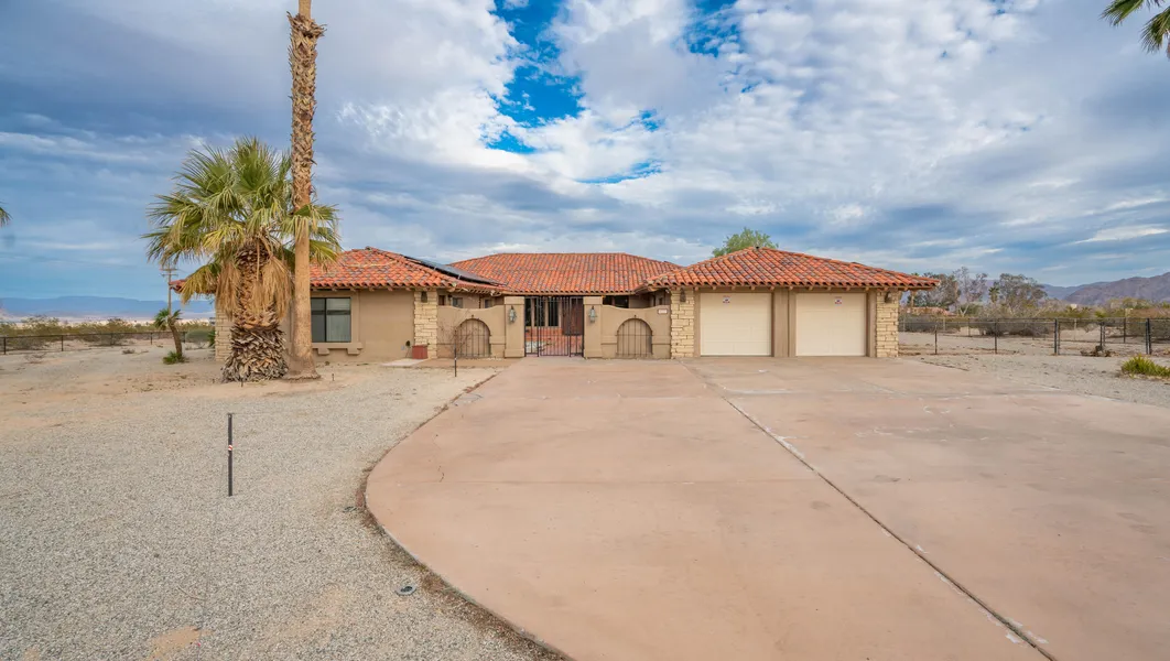 Welcome to your desert oasis in Twentynine Palms, just minutes away from the iconic Joshua Tree National Park entrance and Marine Corps Air Combat Center Twentynine Palms. Situated on a sprawling 2.6-acre corner lot, this exquisite property offers the perfect blend of luxury, comfort, and convenience. As you enter through the large fenced and gated entrance, you'll be greeted by a spacious 3,000 square foot home with a striking oversized two car garage, providing ample space for vehicles and storage. Step inside the single-story residence, where you'll find 3 bedrooms, 3.5 bathrooms, and a host of exceptional features. The home boasts impressive 9 foot ceilings adorned with natural wood beams, creating an inviting atmosphere throughout. The gourmet kitchen is a chef's dream, boasting high-end KitchenAid appliances, quartz countertops, and a deep farmhouse sink. With a convenient half-bath for guests and a designated laundry room, every detail has been thoughtfully considered. The enclosed sunroom at the rear of the house provides a peaceful lounge space, perfect for entertaining or simply unwinding in solitude. The highlight of the home is undoubtedly the private swimming pool and spa, offering a tranquil retreat amidst the desert landscape. Benefit from the cost-saving advantages of the leased solar system, ensuring sustainable living and reduced energy costs. Whether looking for a short-term rental investment or full time residence this property offers luxury in both.