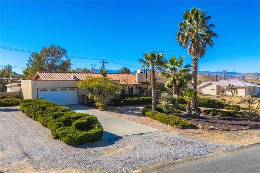 Presenting 8318 Palomar. A spacious and really well maintained 1700 square foot, two bedroom, two full bath home in the desirable Sky Harbor neighborhood of Yucca Valley. The home is on a large, over half acre lot and boasts great views, a nice layout, an enclosed porch that would be great for entertaining or other and a large fenced in back yard which is just gorgeous and well manicured. As you enter the home you are greeted by a very nice sunken living area with beautiful exposed beamed ceilings, a wood burning fireplace and built in shelves. The kitchen is well appointed with plenty of cabinetry for storage, tile counters and a large windows looking out to a nice views and views of the back yard. The 1700 square feet in the home is really nicely distributed between a very large primary bedroom with ensuite bathroom and huge cedar lined walk in closet, an large interior laundry room also with lots of built in storage and the good sized second bedroom and full hall bathroom. There are some other nice touches like a wet-bar and built in shelving adjacent to the dining area. The large enclosed porch with a full wall of windows to allow light and warmth into the room is a really nice addition to the home as a flex space for whatever additional room you need. The enclosed front yard is a space that really adds a pleasing additional outdoor space with its views and nice landscaping it makes for another great place for a pet, play place, sipping coffee spot or similar to relax on. The home has a two car garage, RV parking on the side of the home and a useful circular driveway. The interior of the home is cooled and kept warm with central heating and air. Located less than 10 miles from the main entrance to Joshua Tree National park and just down the street from Black Rock park featuring the same landscapes as well as miles and miles of hiking this is a great jump off point for both locations as well as so many other great natural settings, commercial areas like down town Joshua Tree, Pioneer Town, Old Town Yucca and so much more. Palm Springs is also just a 45 minute drive from here. Come take a look at this great home and make it yours. Seller is willing to consider concessions for a qualified buyer.