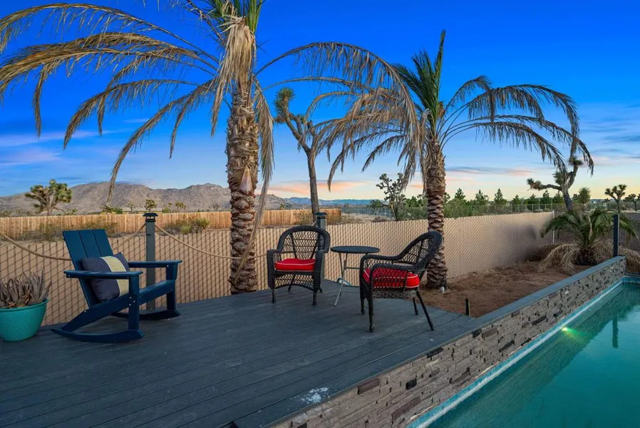 Experience tranquil nights in this stunning Joshua Tree home on spacious grounds. Featuring 3 bedrooms, 2 bathrooms, an office, separate dining room, and a den! This home has the perfect layout with a split floor plan and open concept for the central area. Entertain effortlessly in the large kitchen with island and ample storage. Cozy up in the family room by the rock fireplace with a wood stove insert. The property includes a large 16 X 40 separate RV garage that is conveniently hooked up with power and plumbing. Modern conveniences include a whole house water filtration system, solar energy, and central AC/Heat. There is a custom doggy door that leads to a private walled off section of the back yard. The backyard includes a metal insulated patio cover, built-in BBQ, and hot tub. Plus, enjoy the in-ground vinyl pool and custom deck. The views are breathtaking and the home is designed to enjoy every minute of having a special piece of the highly sought after lifestyle in Joshua Tree.