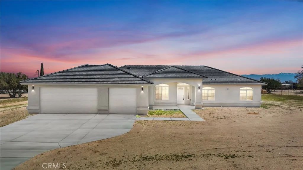 BEAUTIFUL NEW CONSTRUCTION HOME SITUATED ON A HUGE 2.77 ACRE LOT IN SOUTHWEST HESPERIA. Four Bedrooms & 2.5 Baths. Master with Large Closets & Separate Tub & Shower. Separate Family Room w/ F. P & tile flooring. Large Kitchen with solid surface counter tops, custom backsplash tile flooring, lots of cabinets & large pantry... Formal Dining, Breakfast Nook, Indoor Laundry, covered patio & 3 car garage. Gigantic yard! Perfect for a POOL, ADU or you decide. This home is convenient to freeway, shopping, and schools. Solar is owned and is installed with the minimum standards as required by the state . (some photos of similar property)