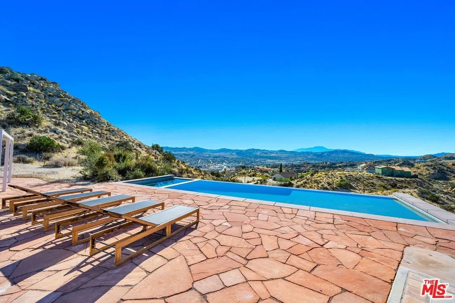Spectacular 4-Bedroom Desert Estate with Infinity Pool, Panoramic Views & Custom Finishes on 2.5 Acres. Welcome to your private hillside oasisan architecturally distinctive 4-bedroom, 2.5-bathroom home offering approximately 3,400 square feet of beautifully crafted living space, perched on 2.5 acres with unobstructed high-desert and mountain views. This one-of-a-kind property is perfect for those seeking luxury, privacy, and dramatic natural beauty. From the moment you arrive, the gated entry and circular drive set the tone for this custom Spanish-influenced retreat. A tiered fountain anchors the front courtyard, surrounded by low-maintenance desert landscaping and mature native plants. Step through hand-carved double entry doors into a grand living space where vaulted tongue-and-groove ceilings soar overhead and massive picture windows frame jaw-dropping views. A striking stone fireplace serves as the centerpiece of the great room, seamlessly connecting indoor living to the expansive outdoor entertaining areas. Designed for both comfort and entertaining, the open-concept floorplan includes a stunning chef's kitchen with quartz countertops, artisan backsplash tile, custom open shelving, stainless steel appliances, and wraparound corner windows that capture endless desert light. A charming dining nook adorned with three stained-glass arched windows and wood-paneled walls offers an intimate setting for meals with family and friends. The luxurious primary suite features its own private slider to the pool patio, mountain views, and a beautifully designed en-suite bath. Three additional bedrooms provide ample space for guests, a home office, or creative use. Throughout the home, you'll find curated finishes including handcrafted lighting, vintage tile, wood floors, and rustic design details that enhance the home's warm and welcoming character. The resort-style backyard is the crown jewel of the property. An infinity-edge pool and spa appear to spill directly into the horizon, while the flagstone pool deck offers multiple lounge areas, fire pit, and a setting unlike any other. Whether you're hosting sunset gatherings or enjoying serene morning coffee with a view, this space is designed to inspire. Other highlights include a detached bonus structure (perfect for a studio or guest use), ample parking, and proximity to hiking, downtown amenities, and Joshua Tree National Park.