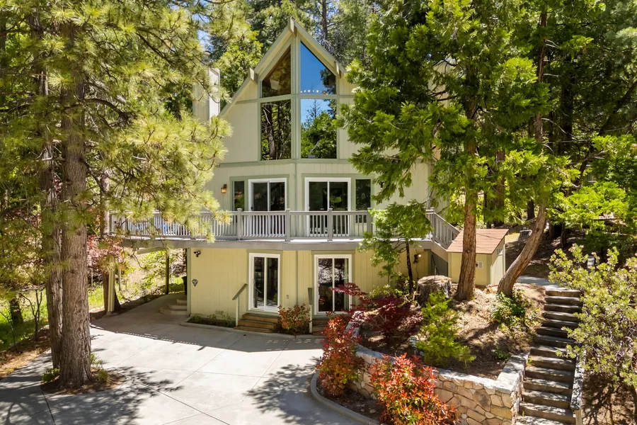 Welcome to your dream getaway in beautiful Lake Arrowhead. Situated on nearly 1/3 acre of lush, private land, this beautifully renovated prow-style home offers the perfect blend of modern comfort and classic mountain character—plus lake rights! Tucked into a serene setting with lush landscaping and a seasonal stream, the home features a spacious wrap-around deck ideal for entertaining or soaking in the peaceful surroundings. Inside, the open-concept living and kitchen area is filled with natural light, highlighted by soaring beam ceilings and a stunning stone fireplace that creates a warm and inviting atmosphere. The expansive primary suite is set on its own private upper level for added comfort. On the lower level, a custom-designed bonus space complete with a built-in wet bar, cozy nook seating, pool table and a second stone fireplace that adds a rustic touch to the entertainment area. A generous laundry room is already plumbed and sized for a potential third bathroom, and there’s abundant storage throughout the home. With a massive concrete driveway offering parking for 6 to 8 vehicles—plenty of room for guests, or even a boat—and easy year-round access to main roads, this home is as practical as it is picturesque. Whether you're looking for a full-time residence, vacation escape, or investment opportunity, this Lake Arrowhead property delivers comfort, charm, and room to relax.