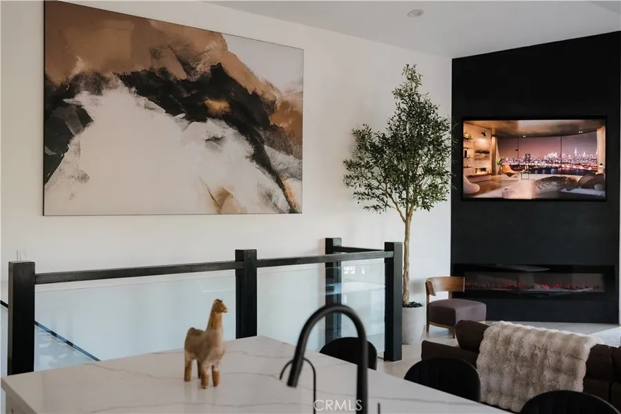 The adjacent living and dining area is anchored by a stunning fireplace finished in Roman Clay from Portola Paints, offering a soft, matte texture that adds warmth and artisan character. Glass railings add a modern architectural touch, enhancing the home's open feel while allowing views to flow freely.