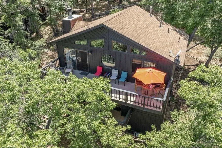 Tucked away in Upper Moonridge, this charming mountain cabin offers stunning panoramic valley views and a secluded 'tree-house' feeling-surrounded by mature oaks and pines on a spacious 12,000 sq ft lot. Whether you're enjoying crisp mountain air and vibrant colors from the elevated front deck or exploring nearby trails, this property delivers the perfect blend of nature, comfort, and convenience. Inside, the well-maintained home features vaulted ceilings, knotty pine accents, and beautiful wood laminate flooring throughout, creating a warm and inviting mountain feel. The upgraded kitchen is equipped with stainless steel appliances and blends seamlessly into the open living space, where an impressive river rock wood-burning fireplace adds cozy ambiance on chilly evenings. Modern upgrades include forced air heating, updated bathrooms, and underground utilities offer unobstructed views. A generous under-house storage area is ideal for bikes, kayaks, or winter gear, making this home as functional as it is beautiful. Located just minutes from Bear Mountain Ski Resort, golf, Big Bear Lake, and The Village, and with easy access to nearby hiking and biking trailheads, this property is perfectly positioned for year-round adventure. Furnishings are negotiable, offering a turnkey option for a primary residence, vacation home, or investment cabin.