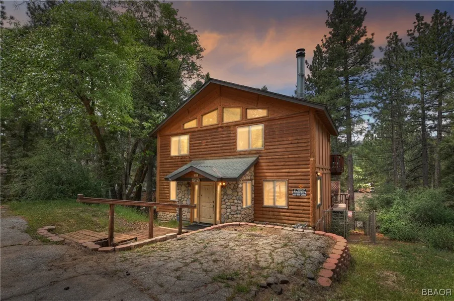 Beautiful log-sided Chalet with ski slope views! ~ This charming mountain home offers the perfect blend of rustic elegance and modern comfort ~ Located just minutes from Bear Mountain Resort, this three bedroom, three bathroom chalet is situated on a spacious lot with ample parking and stunning south-facing views of the ski slopes ~ The living room features inviting wood interior accents and vaulted wood-beamed ceilings, abundant natural light, and a cozy corner fireplace ~ The multilevel decking provides ideal outdoor living space, complete with a new spa for soaking under the stars ~ Two of the bedrooms are en-suite, making this home well-suited for full-time living, a weekend retreat, or continued success as a proven vacation rental ~ The layout is ideal for entertaining and offers flexibility for families, couples, groups and even pets, offering a fenced yard ~ Minutes from skiing, hiking, golf, the zoo, and Big Bear Lake ~ Enjoy the fresh mountain air, slower pace of life, and close proximity to all that Big Bear has to offer ~ Enjoy the luxury of top-notch amenities ~ Don't miss your opportunity to create memories that last a lifetime.