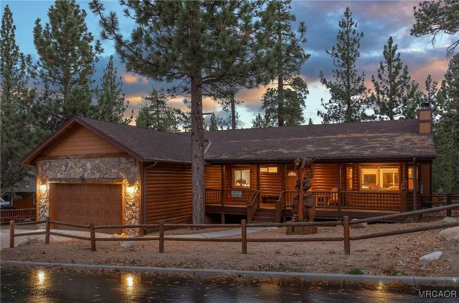 Welcome to Eagle Mountain Estates-where refined mountain living meets everyday comfort. This single-story, log-style home, built in 2003, sits on a generous 10,000+ sq ft lot and offers approx. 2,200 sq ft of thoughtfully designed living space. Soaring vaulted ceilings and warm wood textures create an inviting lodge atmosphere, while large windows bring in beautiful natural light and frame the forested surroundings. The spacious floor plan includes three en suite bedrooms, providing privacy and convenience for family and guests alike. The primary suite offers a peaceful retreat, while the additional bedrooms are perfectly suited for hosting, remote work, or extended stays-each with its own attached bathroom for added comfort. Recent upgrades elevate the home's efficiency and livability, including a new Aspen spa, new A/C system, new whole-home humidifier, new garage door, and solar panels to help reduce utility costs year-round. Step outside and enjoy Big Bear's four-season lifestyle from a large, refinished back deck that's perfect for entertaining, outdoor dining, or relaxing under the stars. The charming covered front porch sets the tone for slow mornings with coffee and quiet evenings taking in the mountain air. The attached two-car garage and level access make this home practical in every season. Located in one of Big Bear's most sought-after neighborhoods, you're close to the lake, ski slopes, hiking trails, and local conveniences while still feeling tucked away in your own retreat. A standout blend of comfort, character, and quality-this is mountain living done right.