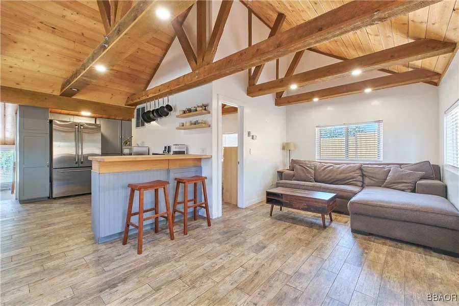 Upgraded cottage a block from lake access. The entire interior was recently remodeled with perfect blend of modern feel with rustic touch. Light and bright open floor plan with open beam vaulted ceilings and cozy fireplace. Beautiful Kitchen w/ butcher block countertops and breakfast bar. Stainless steel appliances. Tiled shower/tub with glass doors. Property is fenced with wood privacy fence. plenty of flat parking and a large storage shed. Detached garage was converted to a workshop office and it's own bathroom. Close to everything, the lake, the Village, Snow Summit and Bear Mountain Ski Resorts and hiking trails. This property is perfect starter home, short term rental or mountain retreat.