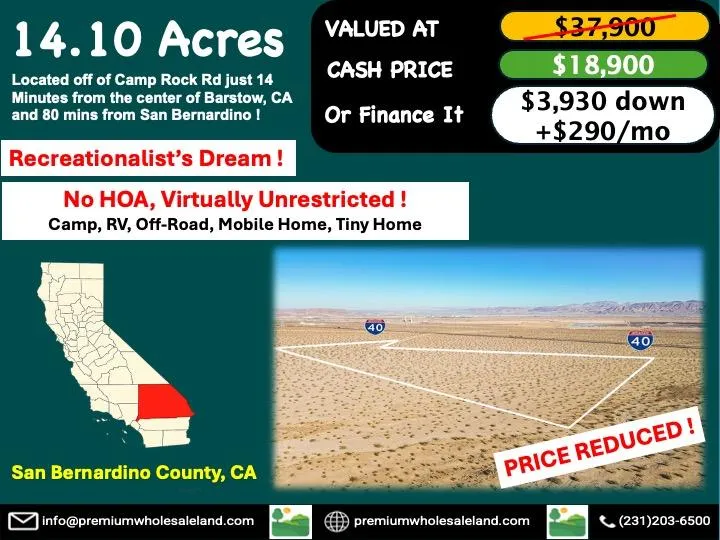 Calling all recreational enthusiasts! Escape to your own 14.1-acre desert retreat in Barstow, CA, zoned Resource Conservation (RC) and offering endless potential for your dream single-family home, tiny home, or mobile home. With no HOA and short-term rentals allowed, you can also use it as a private getaway for camping, off-roading or RVing. This property features a gentle slope, natural desert brush, and stunning panoramic views, with easy dirt road access maintained by the county. Located near iconic attractions like Calico Ghost Town, Big Bear Lake, and Mojave National Preserve, you'll enjoy the perfect mix of peace, adventure, and convenience. Dont miss this chance to own a spacious desert property with limitless potential!