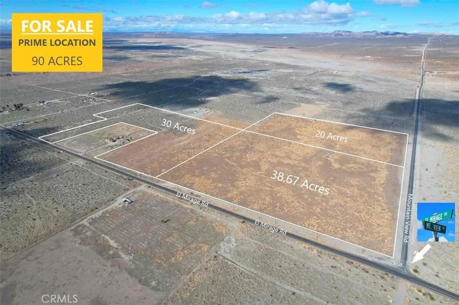 PRIME ACREAGE FOR SALE. EXTREME EXPOSURE. Flat 90 acres for Sale. (*Approx. 88.67 acres, rounded to 90) With Over 3,988 feet* of Frontage, this property would be the crown jewel of any Real Estate Holding Portfolio. Property includes 3 contiguous parcels (A 30 Acre parcel: APN 0458-082-03; a 38.67 acre parcel APN: 0458-082-04 and a 20 acre parcel APN: 0458-082-05) which all together create a unique prized Lot in this developing are of El Mirage/Adelanto. Frontage on El Mirage Blvd is approx. 1,981 Feet and frontage on Mountain View Rd is approx. 2,007 ft. El Mirage Blvd is the main corridor in the area along with HWY 395. At the same time, El Mirage Off Road Vehicle recreational area entrance is located right next to the subject property. This OHV area has recreation opportunities for motorcycles, ATVs, trucks, cars, buggies, land yachts, model airplanes, model rockets, ultra-light aircr...