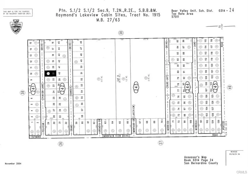 Land for sale Baldwin Lake Area. This could be the place to appreciate the beauty within Baldwin Lake outdoors and within the Big Bear City limits. Legal description Raymonds Lake View Cabin Sites TR NO 1915 Lot 21. Flat and level lot with electricity at street. The area takes septic and well if so chooses. Close to Big Bear Lake, town, Pioneertown routes, old mining areas, trails and Baldwin Lake Stables. Parcel number is 0314-242-12-0000. No address assigned. Latitude and longitude coordinates are: 34.268234, -116.786303