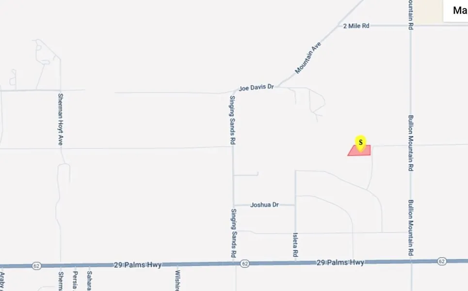 Go Direct. Use a 4WD roads are sand. 3.53 Acres located in the City of 29 Palms CA. The location is only .69 miles from Hwy 62. Enjoy colorful sunsets and incredible stargazing. Unobstructed views across the desert terrain to mountains in the distance. Short drive to the world famous Joshua Tree National Park entrance in 29 Palms. See attached Brochure for more information.