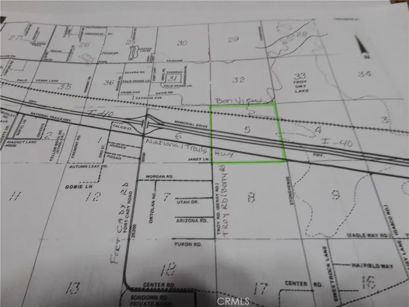 557.77 acres in Newberry Springs. It consists of 4 parcels, stacked on top of each other, that make up an entire Section of land minus the easements for US Hwy 66/National Trails Hwy, I-40, Memorial Drive & the railroad easements. All 4 of these parcels are 1 mile long from east to west. The most southerly parcel, APN 0529-151-09, is 27.26 acres. The north line of this parcel has frontage on the south side of US Hwy 66. It begins at Berry Rd (AKA Troy RD) and continues east 1 mile to Stonehenge Rd. The next parcel going north, APN 0529-151-08, is 129.51 acres. It also begins at Berry Rd (AKA Troy RD) and continues east 1 mile to Stonehenge Rd. It's the land between National Trails Hwy and Eastbound I-40. The next parcel going north, APN 0529-151-07, is 44.31 acres. It's the parcel between Westbound I-40 and Memorial Drive and is also 1 mile from east to west. And last but not least, the 4th parcel going north, APN 0529-151-06 is 373.53 acres. It has frontage on the north side of Memorial Drive and goes all the way north past the railroad to Bon View Ave. The NW corner of this parcel is at the SW corner Bonview Ave & Troy Rd. All 4 parcels together total 577.77 acres, allowing plenty of space & so many options. Solar farm, housing development, crops, livestock or all of the above could be achieved. Crops such as Pistachios, Apricots, Avocado, Peppers, Pomegranite & other crops do well in this area. Buyer to verify zoning & availability of electricity. Residents in the area use private wells, septic systems & propane as there are currently no public services for water, sewer or gas. Electric should be available all along US Hwy 66/National Trails Hwy. DIRECTIONS: From Barstow, take I-40 towards Needles. Take the Fort Cady Rd. Exit, get on US Hwy 66, continue east 1 mile to Troy Rd. (AKA Berry Rd). You will be at the approximate NW corner of the of the most southern parcel. Continue another mile east on Us Hwy 66 to the approximate NE corner of the most southern parcel. To view the parcels on the north side of I-40, go back to Fort Cady Rd, turn right right & cross over I-40, turn right on Memorial Drive and go 1 mile. The property will be on your right & on your left.