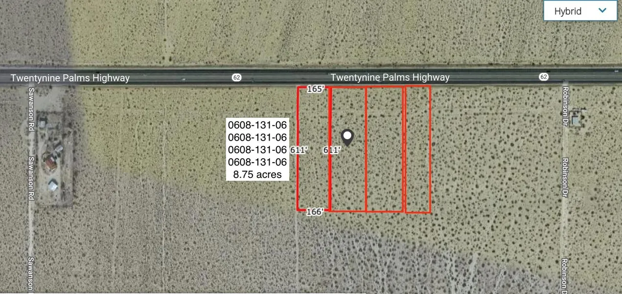4 SEPARATE PARCELS! 8.75 acres on the south side of Hwy 62. This listing includes 4 contiguous APNs - 0608-131-06/07/08/09. Nice residential acreage with Hwy 62 frontage and extremely easy access to Copper Mountain College, 29 Palms and Joshua Tree.