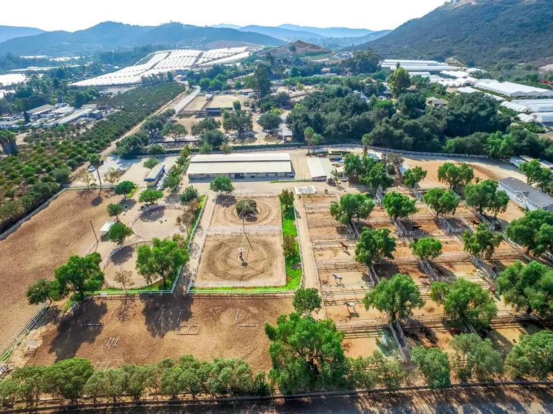 Professional multi-discipline training facility, created by an experienced horseman for an efficient, streamlined operation in a beautiful setting. Offering includes a Major Use Permit allowing up to 84 horses and a commercial equestrian business, 3 barns, fenced paddocks, arenas, walkers, office with viewing deck, plus a private, upgraded owners home and caretaker residence overlooking the entire operation. Suitable for a professional, an investor, or anyone desiring the equestrian lifestyle and potential income. Enjoy cool breezes and panoramic vistas in this peaceful Twin Oaks Valley location.