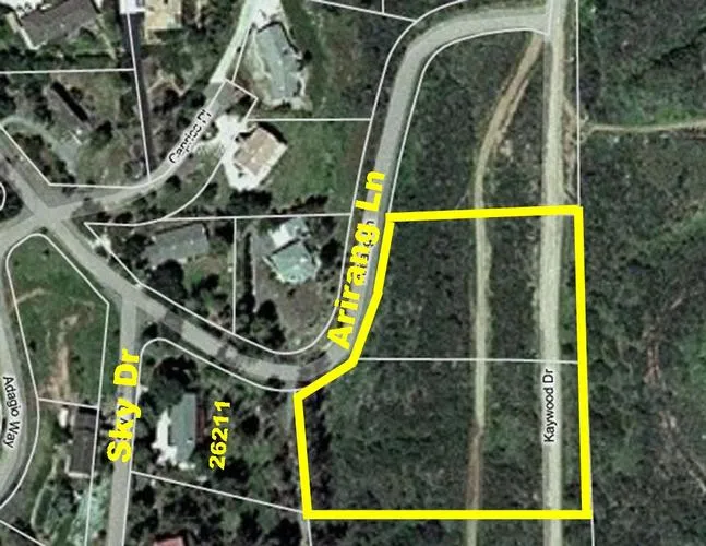 Directions: From I-15 take the Deer Springs Rd exit toward Mountain Meadow Rd. From Deer Springs go soutn on N Centre City Pkwy. Turn east on Ivy Dell Ln. Turn right on Jesmond Dene Rd. Turn left on N Broadway. Take the first right on North Ave. Take the first left on Laurashawn Ln. Take the second right on Adgio Way. Turn right on Sky Dr and go a short distance. Continue straight on Arirang Ln. Parcel is on Arirang Ln behind the house at 26211 Sky Dr. It starts on the right just past the black iron fence. Take an aerial map showing boundaries with you.