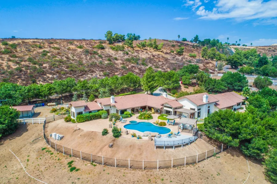 Sprawling Equestrian Estate situated on 9.73acres only minutes to downtown Poway. Professionally installed large arena, 4 stall barn w/tack-room and feed-room, 4 stall Mare Motel. Access to Poway 60-mile Trail system. This 5600 sqft single-story home is an entertainer's dream with gourmet kitchen, butler pantry, pool/spa, BBQ and panoramic views that go on for miles. Ensuite bedrooms with outdoor access. Attached guest suite with kitchenette & living-room. An ideal home for family and horses!