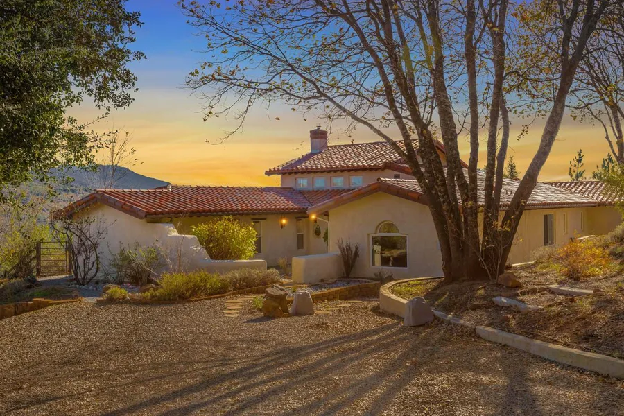 Enjoy country living with AMAZING PANORAMIC VIEWS and PEACEFUL PRIVACY at the 11+ acre Quiet Oaks Country Retreat located in the desirable community of Pine Hills. The rambling hacienda ranch style home features 2,400 esf with 3 bedrooms and 2 baths of comfortable, functional, energy efficient living space. The open and inviting living room, dining room and kitchen areas are centered around an impressive rock fireplace with wood burning stove highlighting grandiose 16 ceilings with beautifully repurposed wood beams and plentiful windows revealing the picturesque and secluded mountain setting. This custom home features stunning patina finished heated concrete floors, recessed lighting, and built-in wood cabinetry throughout. The roomy kitchen features granite counter tops, stainless steel appliances, ample cabinetry, oversized walk-in food pantry and mudroom. The primary bedroom with decorative, rounded seating area around the perimeter of the room adds character and functionality adjoining master bath with gorgeous, turquoise tiled counter and walk-in glass block shower and large walk-in closet. Two secondary bedrooms provide space for family or guests. Other convenient features include an indoor laundry room with utility sink and attached garage with sizable bonus room. A handsome and versatile 1,600 esf 4-stall barn with half bath, office and tack room, round pen and fenced pastures are ideal for a variety of livestock and other agricultural uses and includes architectural plans for the barn to be converted into a guest house. Extensive hardscaping and landscaping create numerous outdoor meditation and entertaining spaces offering complete tranquility with expansive views and quintessential indoor/outdoor living. Adding to the charm and appeal of this property enjoy meandering pathways, built-in bbq, water fountain, a variety of family fruit trees and berry plots, purposefully planted gardens, and lush native vegetation. Utilities include public power with whole house backup 22 KW generator with plenty of room to add solar, septic system for effluent, solid-producing water well with 5000-gallon of water storage and whole house water filtration system.