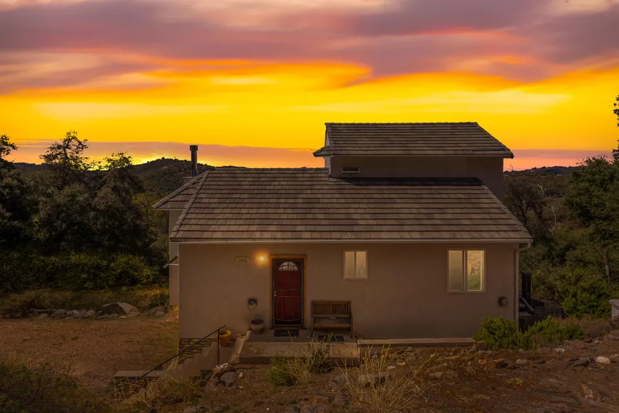 Your secluded, off-grid mountain hideaway awaits! Situated on nearly 5 acres and comprised of two legal parcels, this 1,251sf custom home provides an ideal locale for a weekend retreat or full-time residence. Elevated above a rich canopy of Native Oaks, this custom 2 bed, 2 bath home presents the fulfilling opportunity to live your home renovation dream. Enjoy the open concept primary living area, highlighted by soaring ceilings and decorative wood beam accents. Behold a majestic panorama from almost every room with natural light beaming through expansive view windows. Curl up on a cool day by the country-style wood burning stove or bask in the sun on the view deck. The comfortable and well-designed living concept flows into a sizable kitchen with ample cabinetry and countertops. A beautiful wood staircase beacons you to the second story primary bedroom suite featuring floor to ceiling...