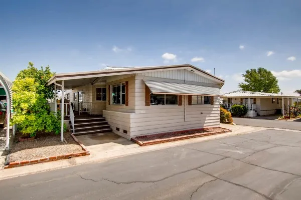 Open and bright unit in Ramona Terrace Estates 55+ park. Nice corner lot location! This open and spacious mobile home offers a nice large living room adjacent to the dining room, nice size master bedroom with ample closet space, large master bath, family room, indoor laundry, extra large shed outside for storage and mature fruit trees. Nice interior location.