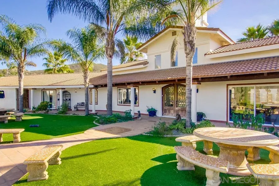 INCREDIBLE BREATHTAKING VIEWS from this beautiful custom Spanish Style Hacienda/Retreat with Blue Dome. Enter through the private gates onto over 8+ acres - with room to roam! Lots of amenities which includes pool, spa, Cabana, tennis court, stables, horse corrals and more. The front courtyard features include a fountain with views of downtown San Diego. Wonderful breezes throughout the year from your mountaintop retreat! Potential for a vineyard or ?? Room to grown and plenty of room for your toys, RV, children and more! Bring your ideas and paint this wonderful estate into your forever dream home.