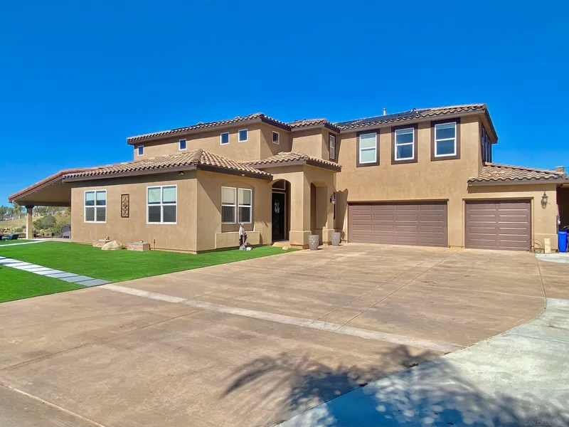 King of the hill in Blossom Valley on over 2.5 acre lot with panoramic sunset ocean views. Gated long driveway will lead you up to this amazing estate. Once up there, you will be greeted by fruit trees, fountain, and views of the ocean. Open floor plan welcomes you with honed travertine tile that leads you to the kitchen with granite island, professional grade appliances, pendant lighting, natural stone and cabinetry compliment the Mission Revival architecture with wrought iron, dramatic fireplaces, and crown moulding. OWNED SOLAR. Master retreat with dual closets, plank flooring, quartz counter tops, designer tile, and seamless glass enclosure. Multi generational floor plan features downstairs full bedroom and bathroom and wheelchair access to shower and graded beach entry to the pool. Upstairs has 4 additional bedrooms with closets, plus optional room/ office, and library. The pool has a graded beach entry and water fall features with stacked stone. This elevated lot has a garden, meandering pavers, and lush landscaping to enjoy the beautiful panoramic views from all outdoor areas. Ample parking for RV, boat, and all your toys. The septic tank is large enough for the possibilities of expansion of the property. Home is centrally located with freeway access to 125/8/67 and proximity to SDSU in 20 minutes. Enjoy a built in gym, spa, pool, and A/C with owned solar panels.