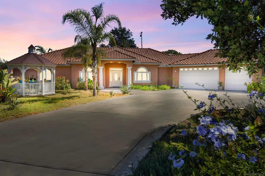 Located on the coveted west end of Ramona youll find this stunning home on 2 acres. As you enter the home there is a tiled entry with inlay design leading to massive living & dining room with vaulted ceilings, marble fireplace & many windows to let the natural light in. Primary bedroom retreat has spacious room, marble corner fireplace, dual sinks, oversized oval soaking tub, separate shower, large organized walk-in closet and access to pool and spa. A Jack n Jill bathroom services 2 bedrooms while the 4th bedroom has bathroom & walk-in closet, perfect for guests. Large home office great for telecommuting. Kitchen with breakfast nook, 2 islands and plenty of cabinet & slab granite counter space adjacent to the gathering room; great for parties. Outside youll find the swimming pool with slide and waterfall spa, variety of fruit trees (apple, orange, lemon, grapefruit, cherry plum, tangelo, nectarine & apricot) plus grape vines, chicken coop and garden areas. Detached building has two rooms plus a loft, great for office or media room. Loaded with little extras like central vacuum, ceiling fans in most rooms, Attic fan & stereo speakers to patio. 3 car attached garage has epoxy floor and fully finished.