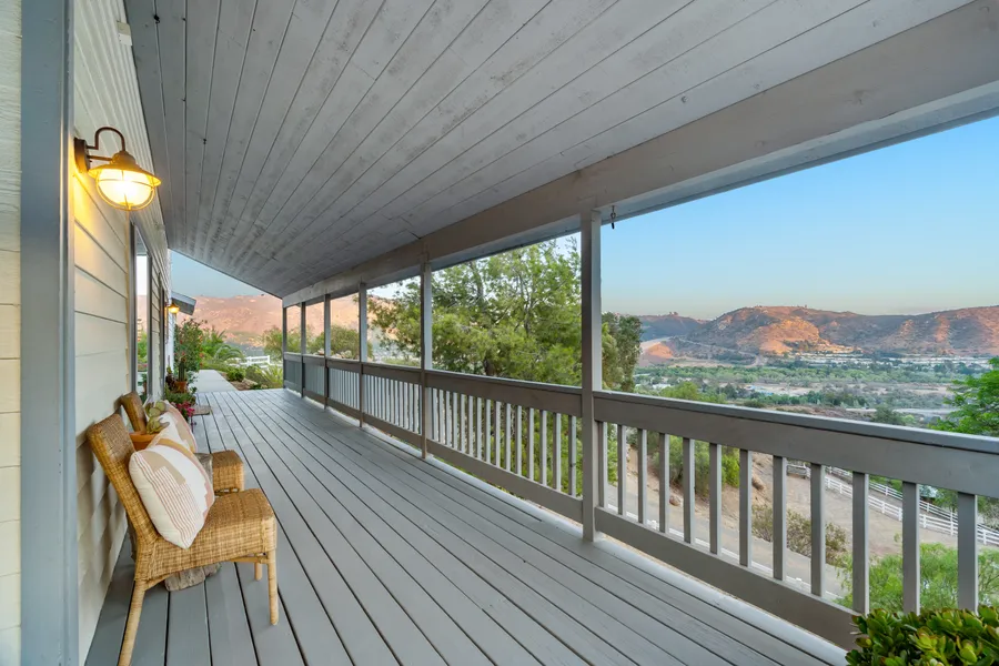 Inspiring and majestic panoramic views of mountains, valleys and avocado orchards await you at this private ranch style property. The south and east facing entrance and deck captures a serene view, perfect for relaxing in the mornings and evenings while listening to the wind through the trees or bird watching. This 4 bedroom 2.5 bath traditional home boasts a 200 square foot custom kitchen with rustic reclaimed wood built by a master woodwork craftsman. The exterior front driveway offers plenty of paved parking spaces that leads to a garage big enough to house a woodworking shop, a truck and more. The lot is fenced and contains useable flat land within over 3 acres of land that can be used for horses and livestock. There are two a separate gates, one leads to a partially paved road that ends at the corral and the other to a flat pad of land big enough for an RV, trailer, or structure. This home has many indoor and outdoor living spaces with room to entertain guests, or to enjoy the tranquil and calming surroundings. A new AC and heating unit were recently added to the home in 2022. Quick access to Interstate 15 and Highway 76 for commuting.